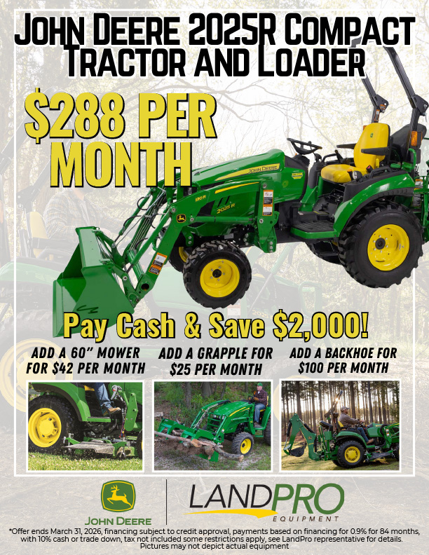 *Offer ends March 31, 2026, financing subject to credit approval, payments based on financing for 0.9% for 84 months, with 10% cash or trade down, tax not included some restrictions apply, see LandPro representative for details. Pictures may not depict actual equipment
