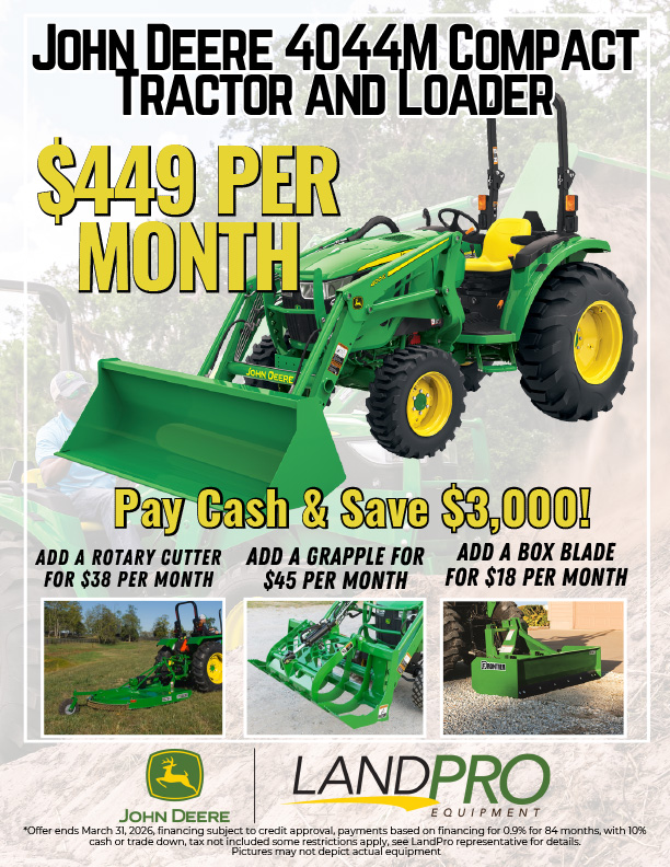 *Offer ends March 31, 2026, financing subject to credit approval, payments based on financing for 0.9% for 84 months, with 10% cash or trade down, tax not included some restrictions apply, see LandPro representative for details. Pictures may not depict actual equipment